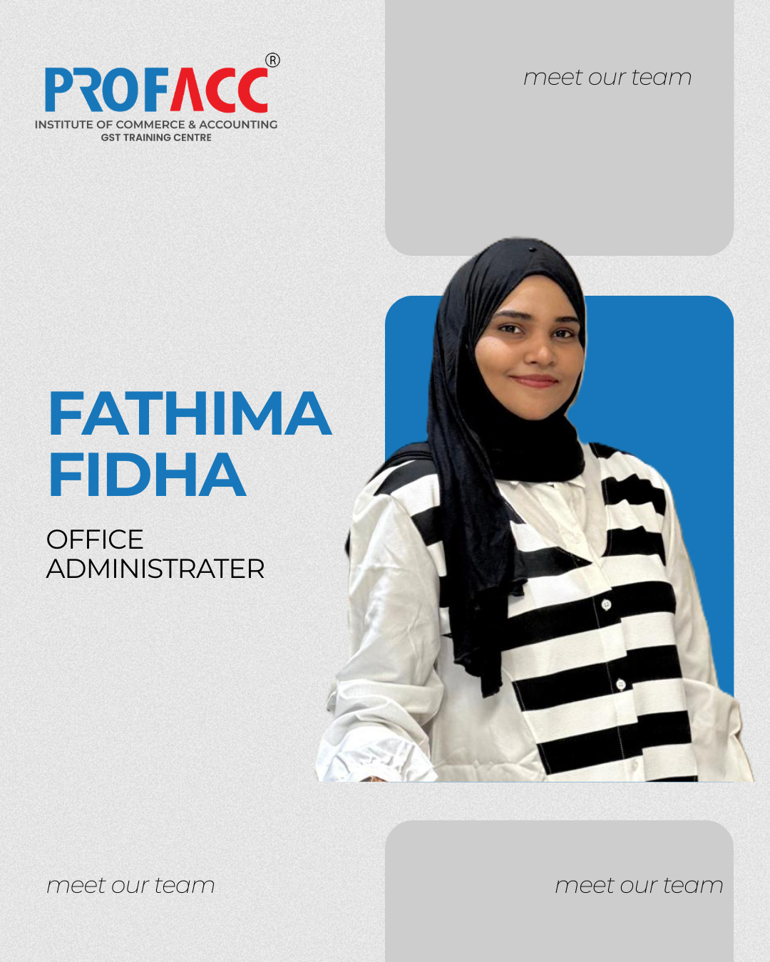 Our office staff play a key role in ensuring the smooth functioning of the academy. They assist students with admissions, course information, scheduling, and daily administrative support. Friendly, organized, and dedicated, our team is always ready to help students with any queries and ensure a comfortable learning experience.